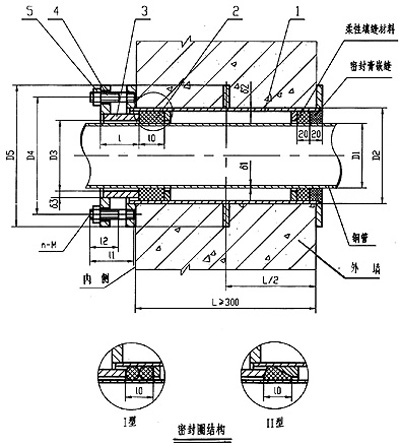 3、套管穿墻處如遇非混凝土墻壁時(shí),應(yīng)局部改用混凝土墻壁,其澆注范圍應(yīng)比翼環(huán)直徑(D5)大200,而且必須將套管一次澆固于墻內(nèi)。