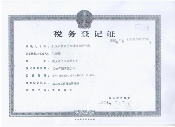 歡迎來到鞏義市新躍供水材料有限公司官方網站!您現在訪問的是:《稅務登記證》頁面,如需幫助請致電:13140066578 或 0371-64100988